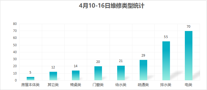 对学校公共设施进行日常巡查、维护,发现问题及时维修、抢修。师生报修问题随报随修,确保公共设施正常运行。本周共接单226单,其中电类70单,给水类21单,门窗类20单,排水类55单,疏通类29单,房屋本体类5单,桌椅类14单,其他类12单,完成212单。