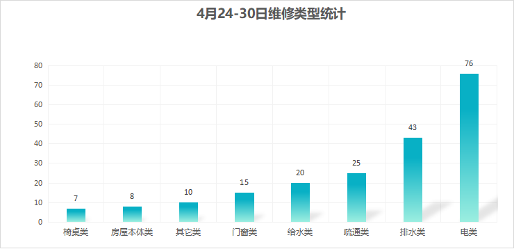 对学校公共设施进行日常巡查、维护,发现问题及时维修、抢修;对师生报修问题随报随修,确保公共设施正常运行。本周共接单204单,其中电类76单,给水类20单,门窗类15单,排水类43单,疏通类25单,房屋本体类8单,桌椅类7单,其他类10单,完成195单。