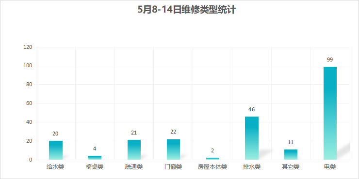 对学校公共设施进行日常巡查、维护,发现问题及时维修、抢修。对师生报修问题随报随修,确保公共设施正常运行,本周共接单225单,其中电类99单,给水类20单,门窗类22单,排水类46单,疏通类21单,房屋本体类2单,桌椅类4单,其他类11单,完成215单。