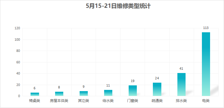 对学校公共设施进行日常巡查、维护,发现问题及时维修、抢修。师生报修问题随报随修,确保公共设施正常运行。本周共接单231单,其中电类113单,给水类11单,门窗类19单,排水类41单,疏通类24单,房屋本体类8单,桌椅类6单,其他类9单,完成216单。
