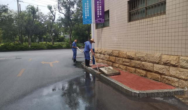 清理环境学院楼宇外围排水设施内淤泥和杂草