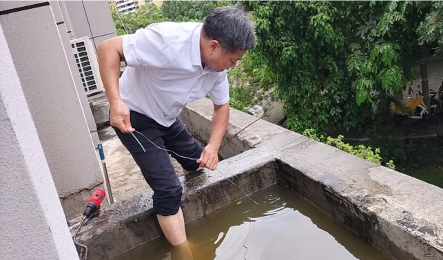 清理资环材学院楼宇天台和排水设施内淤泥和杂草