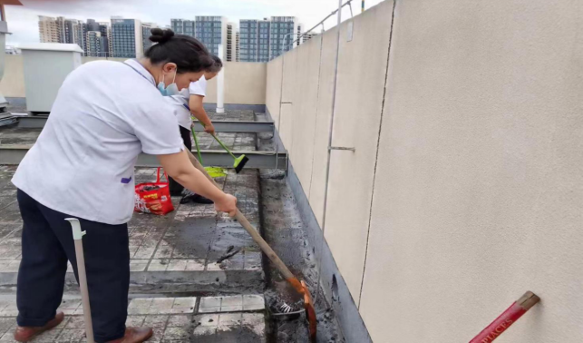 清理化工三号楼宇天台排水设施内淤泥和杂草