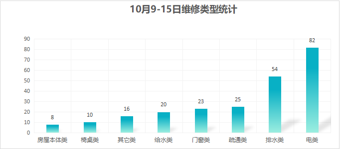 对学校公共设施进行日常巡查、维护,发现问题及时维修、抢修。师生报修问题随报随修,确保公共设施正常运行。本周共接单238单,其中电类82单,给水类20单,门窗类23单,排水类54单,疏通类25单,房屋本体类8单,桌椅类10单,其他类16单,完成238单。