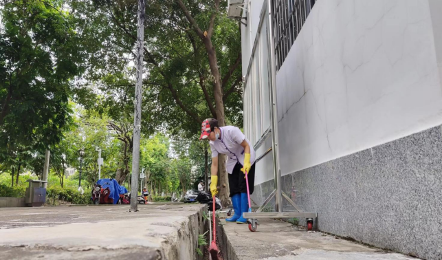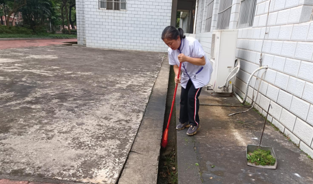 清理机械学院楼宇外围排水设施内杂物和杂草