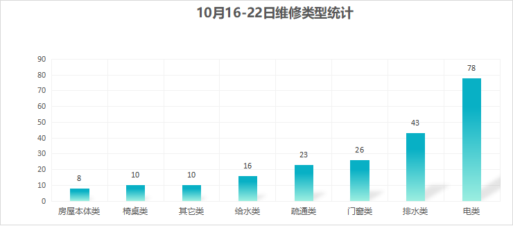 对学校公共设施进行日常巡查、维护,发现问题及时维修、抢修。师生报修问题随报随修,确保公共设施正常运行。本周共接单214单,其中电类78单,给水类16单,门窗类26单,排水类43单,疏通类23单,房屋本体类8单,桌椅类10单,其他类10单,完成211单。