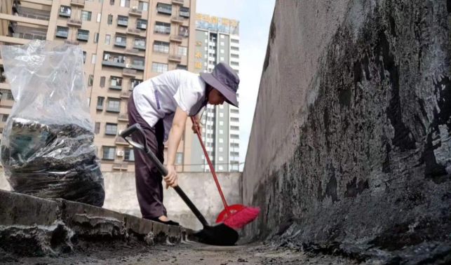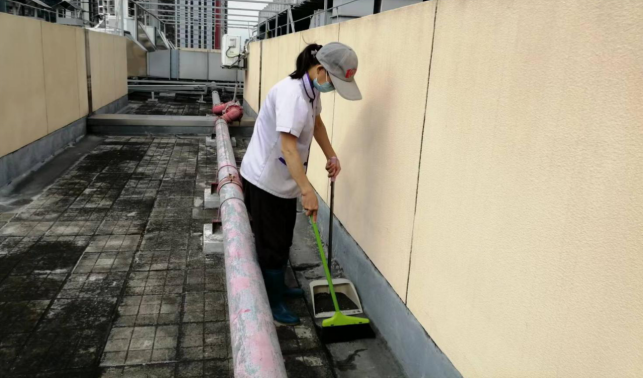 清理轻工学院楼宇天台排水设施内淤泥和杂草