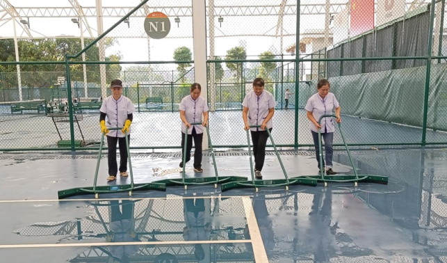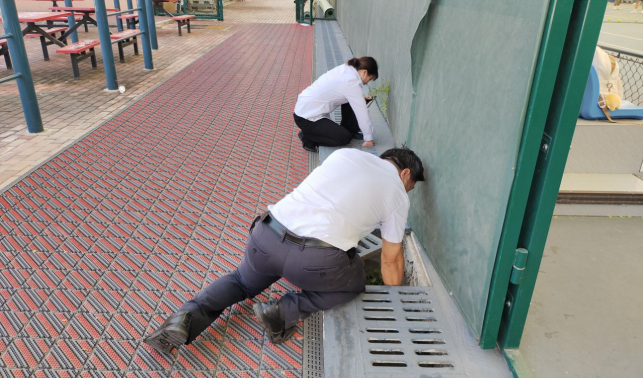 清理网球中心楼宇外围排水设施内杂物和杂草