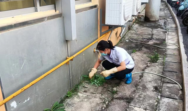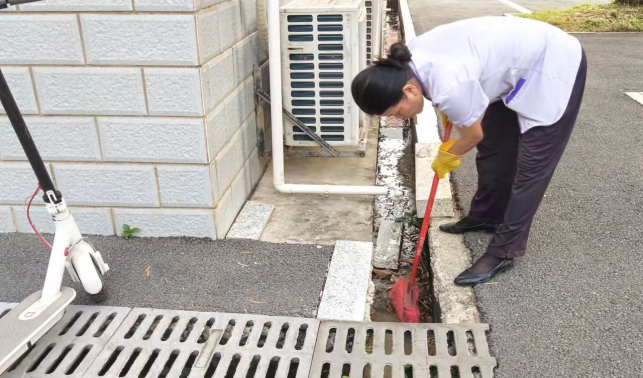 清理语言中心楼宇外围排水设施内杂物和杂草