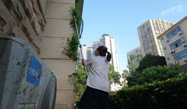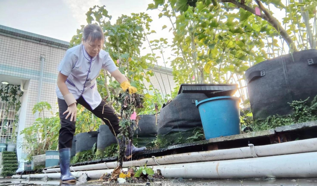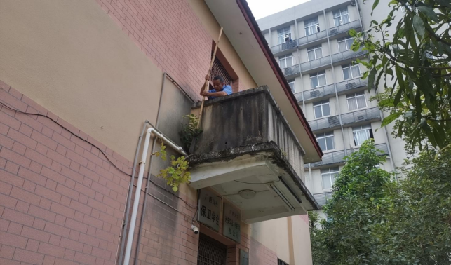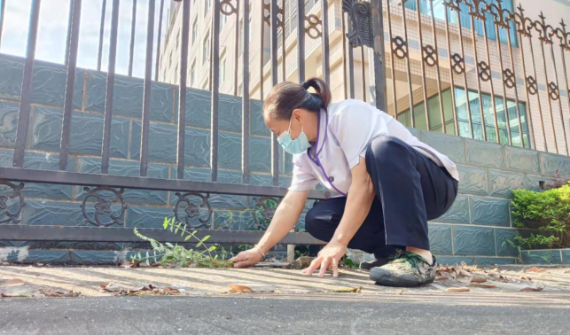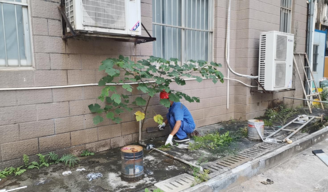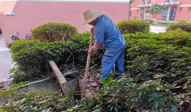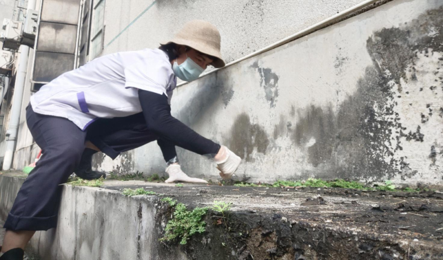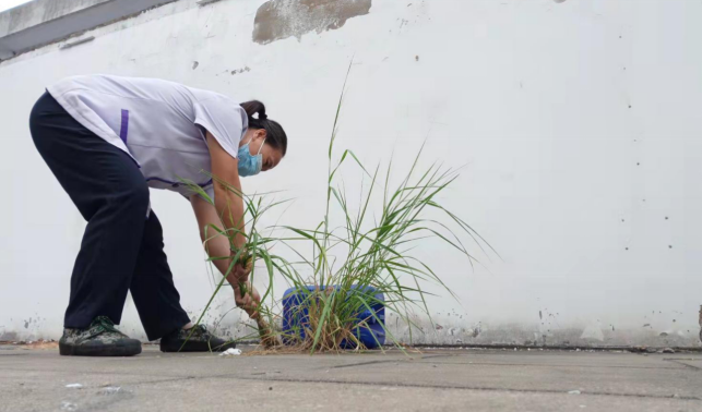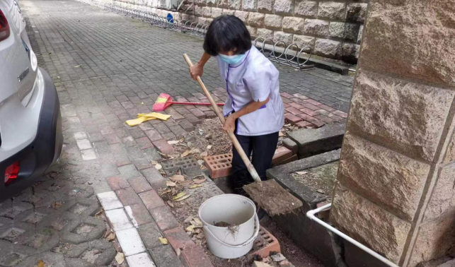 清理环境学院楼宇外围排水设施内杂物和杂草