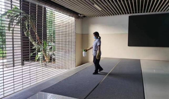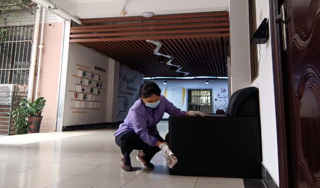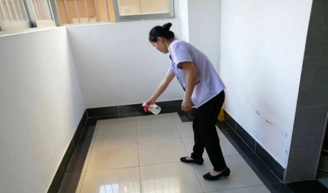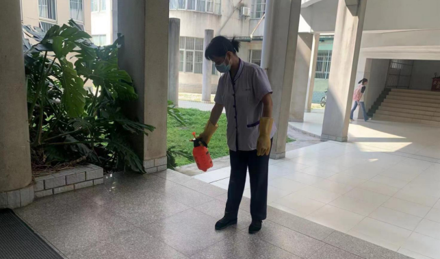 对公共教学楼宇的楼梯、走廊、门把手、课桌椅、电脑键盘、鼠标、水龙头、楼梯扶手、电梯间及按钮等高频接触表面进行重点杀菌消毒846次。