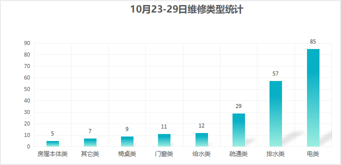 对学校公共设施进行日常巡查、维护,发现问题及时维修、抢修。师生报修问题随报随修,确保公共设施正常运行。本周共接单215单,其中电类85单,给水类12单,门窗类11单,排水类57单,疏通类29单,房屋本体类5单,桌椅类9单,其他类7单,完成212单。