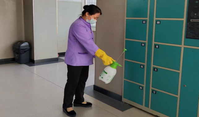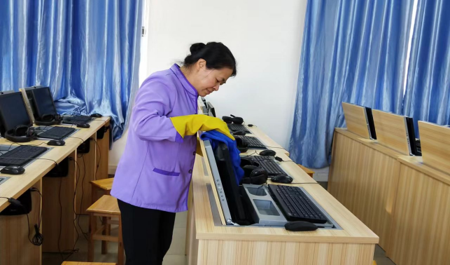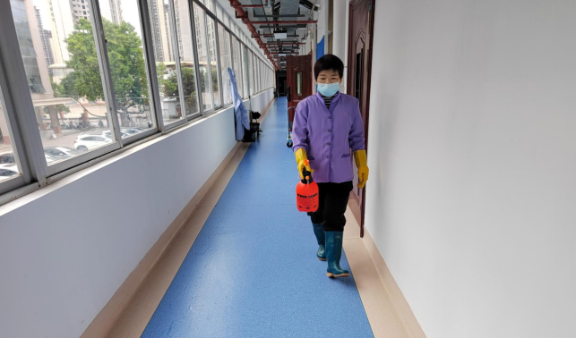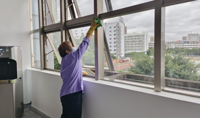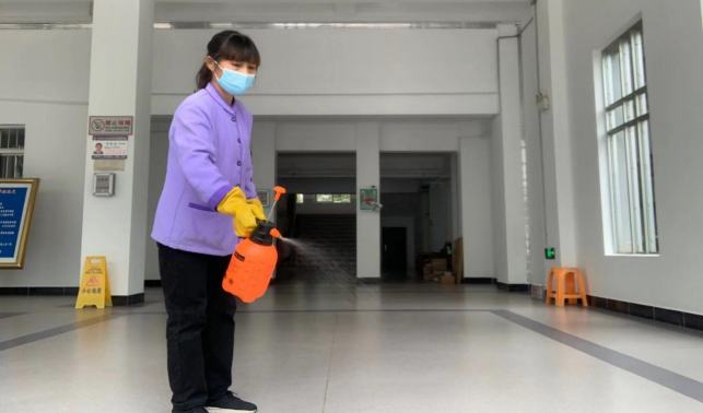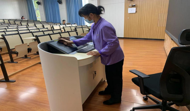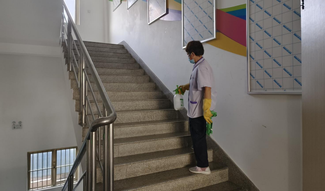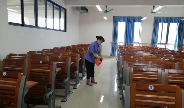 对公共教学楼宇的楼梯、走廊、门把手、课桌椅、电脑键盘、鼠标、水龙头、楼梯扶手、电梯间及按钮等高频接触表面进行重点杀菌消毒876次。
