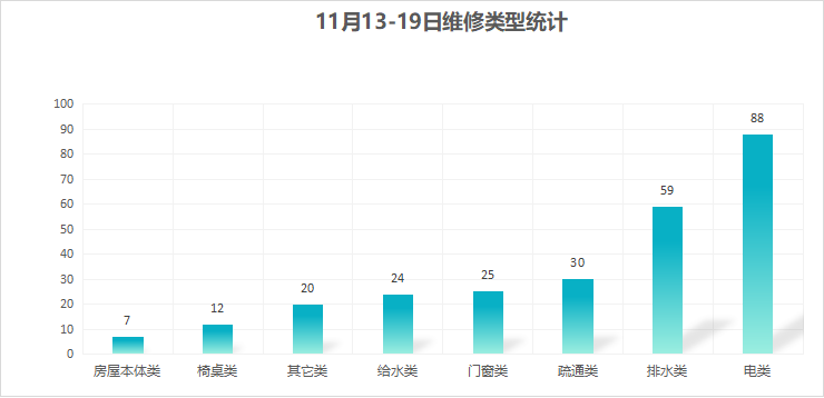 对学校公共设施进行日常巡查、维护,对师生报修问题及时维修、抢修,确保公共设施设备正常使用。本周共接单265单,其中电类88单,给水类24单,门窗类25单,排水类59单,疏通类30单,房屋本体类7单,桌椅类12单,其他类20单,完成260单。