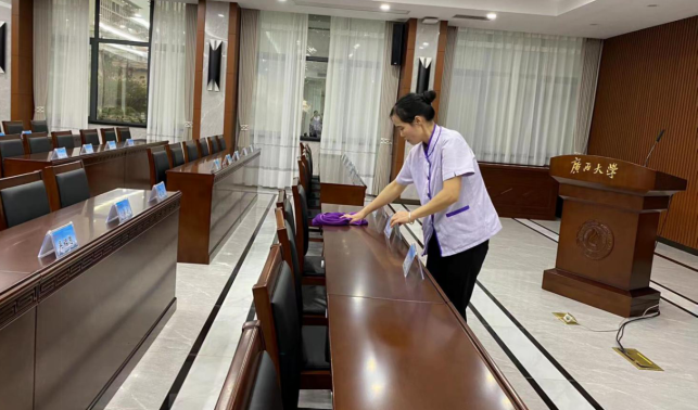 对君武馆、财务处、办公楼、大学生活动中心、保卫处等办公楼宇进行日常卫生保洁等服务工作。