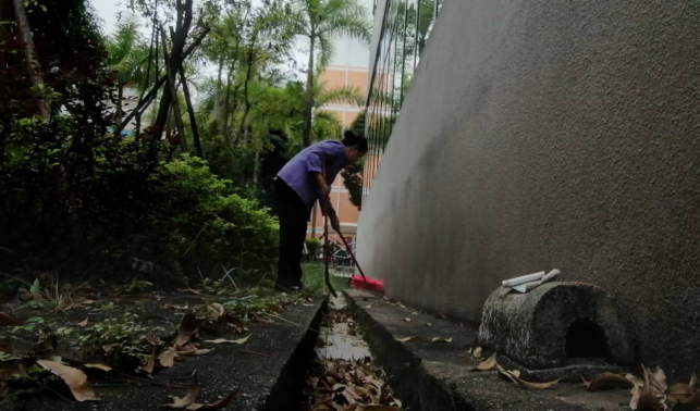 清理君武馆楼宇外围排水设施内杂物和杂草