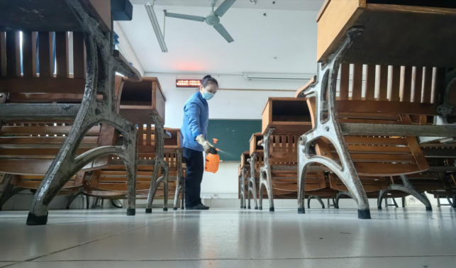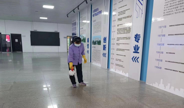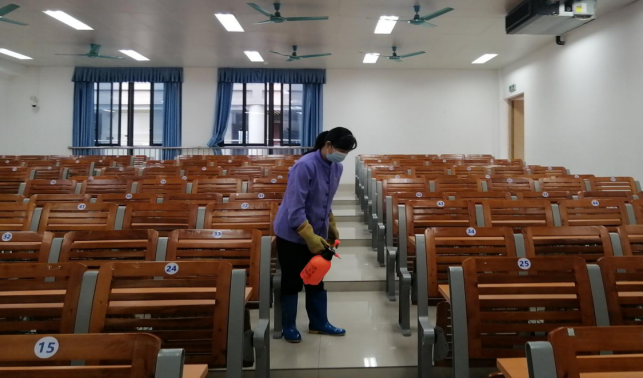 对公共教学楼宇的楼梯、走廊、门把手、课桌椅、楼梯扶手、电梯间及按钮等高频接触表面进行重点杀菌消毒961次。