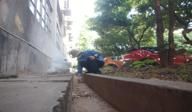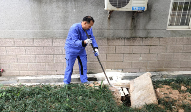 清理脑与智能研究中心楼宇外围排水设施内杂物和杂草