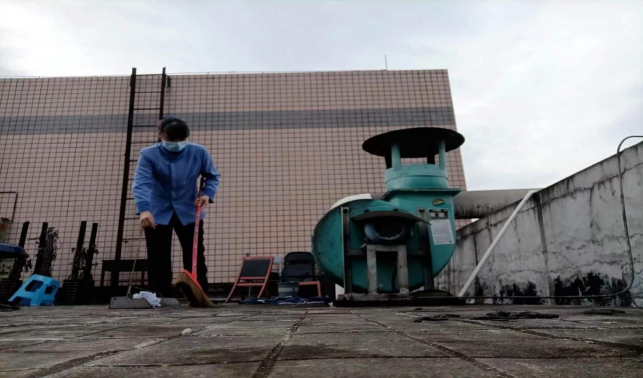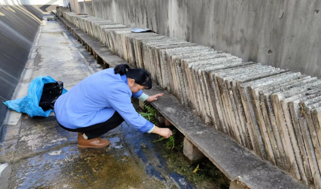 清理轻工学院楼宇天台排水设施内淤泥和杂草
