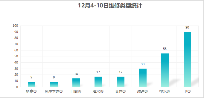 对学校公共设施进行日常巡查、维护,对师生报修问题及时维修、抢修,确保公共设施设备正常使用。本周共接单241单,其中电类90单,给水类17单,门窗类14单,排水类55单,疏通类30单,房屋本体类9单,桌椅类9单,其他类17单,完成234单。