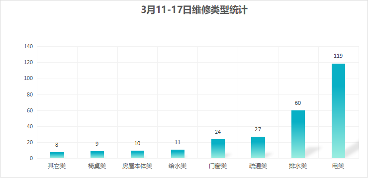 对学校公共设施进行日常巡查、维护,对师生报修问题及时维修、抢修,确保公共设施设备正常使用。本周共接单268单,其中电类119单,给水类11单,门窗类24单,排水类60单,疏通类27单,房屋本体类10单,桌椅类9单,其他类8单,完成262单。