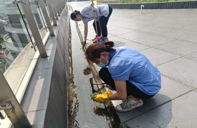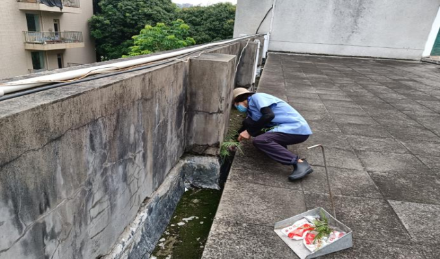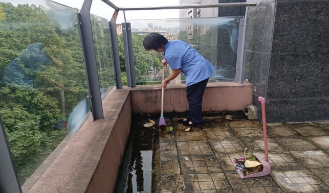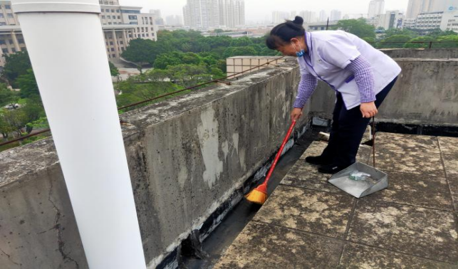 对语言中心、二教、三教、六教、十教、十一教、研究生院和行健学院教室等教学楼宇进行日常卫生保洁服务工作,本周清理公共楼宇外围排水设施58次,清理公共楼宇天台排水设施42处。