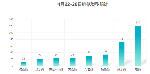 对学校公共设施进行日常巡查、维护,对师生报修问题及时维修、抢修,确保公共设施设备正常使用。本周共接单337单,其中电类120单,给水类22单,门窗类30单,排水类71单,疏通类34单,房屋本体类24单,桌椅类12单,其他类24单,完成313单。
