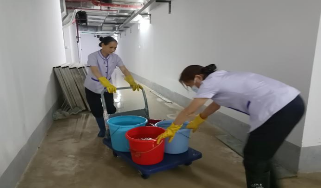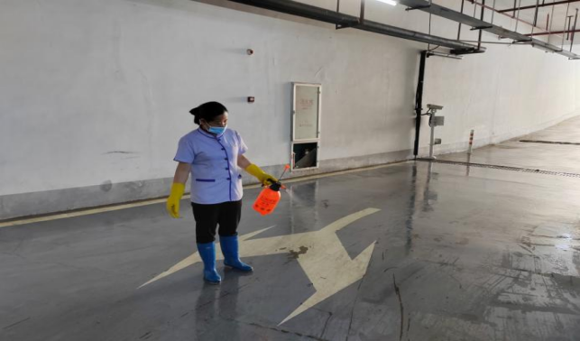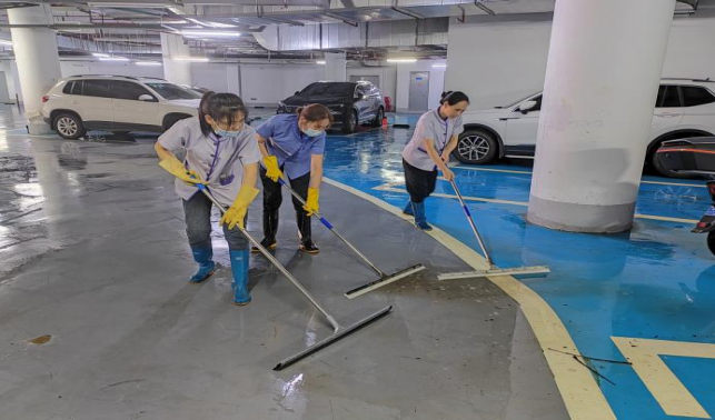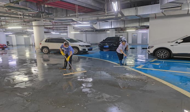 一、清理暴雨后大学生活动中心负一楼停车场积水并做好消毒工作。