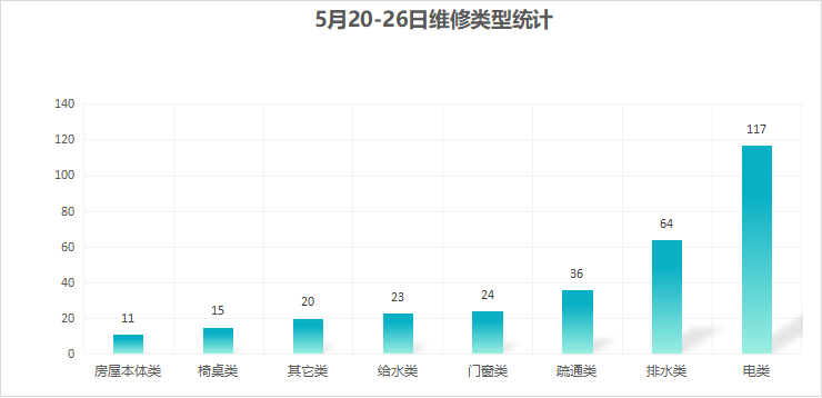 对学校公共设施进行日常巡查、维护,对师生报修问题及时维修、抢修,确保公共设施设备正常使用。本周共接单310单,其中电类117单,给水类23单,门窗类24单,排水类64单,疏通类36单,房屋本体类11单,桌椅类15单,其他类20单,完成296单。