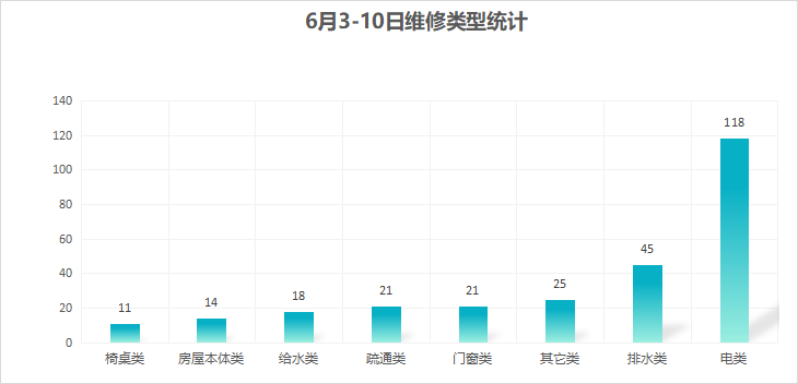 对学校公共设施进行日常巡查、维护,对师生报修问题及时维修、抢修,确保公共设施设备正常使用。本周共接单273单,其中电类118单,给水类18单,门窗类21单,排水类45单,疏通类21单,房屋本体类14单,桌椅类11单,其他类25单,完成262单。