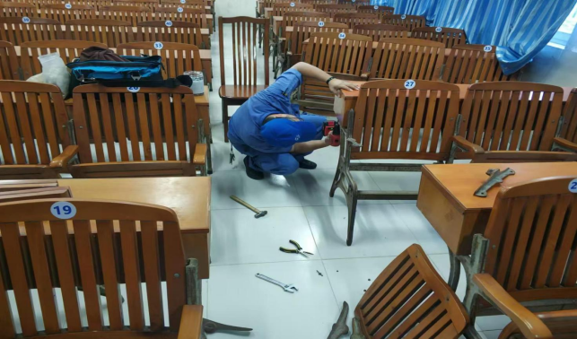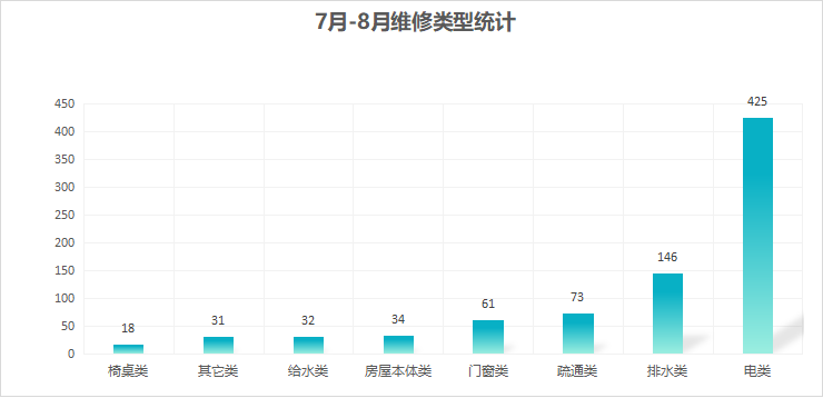 对学校公共设施进行日常巡查、维护,发现问题及时维修、抢修。师生报修问题随报随修,确保公共设施正常运行。7-8月共接单820单,其中电类425单,给水类32单,门窗类61单,排水类146单,疏通类73单,房屋本体类34单,桌椅类18单,其他类31单,完成788单。