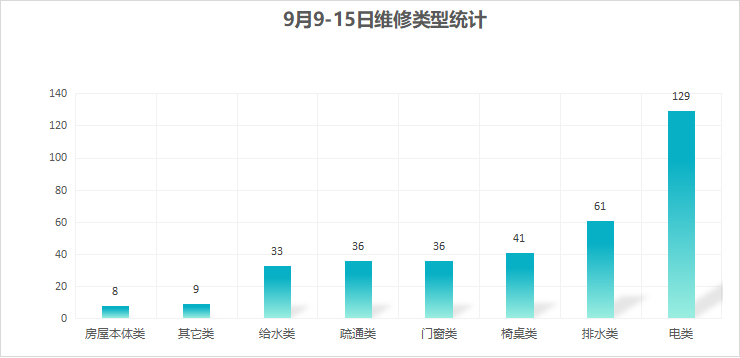 对学校公共设施进行日常巡查、维护,对师生报修问题及时维修、抢修,确保公共设施设备正常使用。本周共接单353单,其中电类129单,给水类33单,门窗类36单,排水类61单,疏通类36单,房屋本体类8单,桌椅类41单,其他类9单,完成332单。