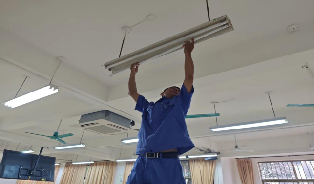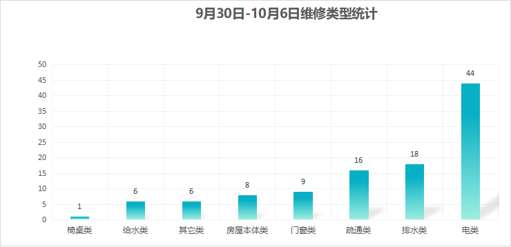 对学校公共设施进行日常巡查、维护,对师生报修问题及时维修、抢修,确保公共设施设备正常使用。本周共接单108单,其中电类44单,给水类6单,门窗类9单,排水类18单,疏通类16单,房屋本体类8单,桌椅类1单,其他类6单,完成107单。