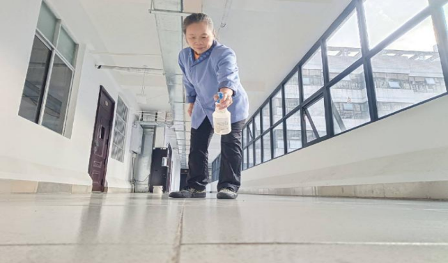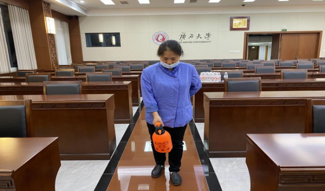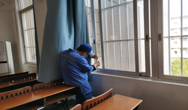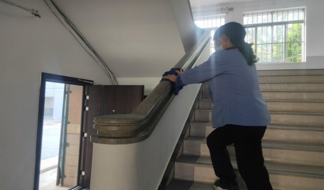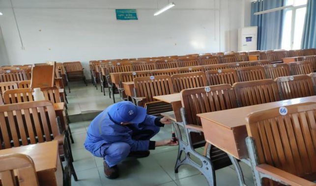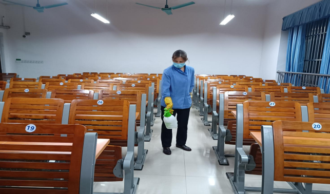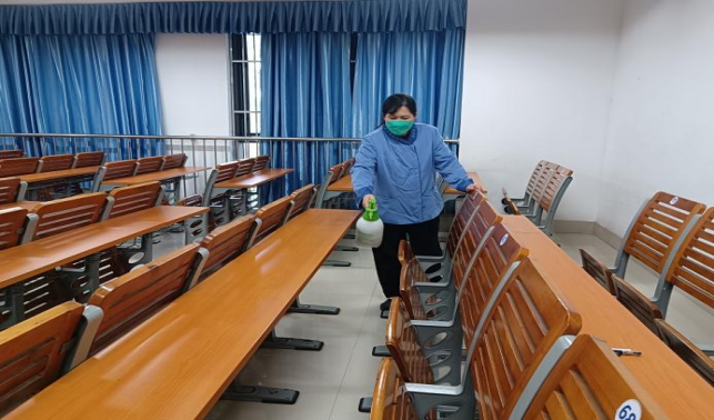 对公共教学楼宇的楼梯、走廊、门把手、课桌椅、电脑键盘、鼠标、水龙头、楼梯扶手、电梯间及按钮等高频接触表面进行重点杀菌消毒584次。