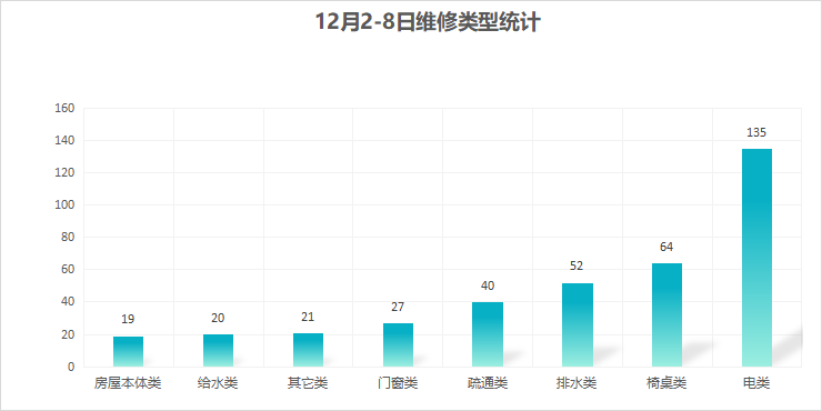 对学校公共设施进行日常巡查、维护,对师生报修问题及时维修、抢修,确保公共设施设备正常使用。本周共接单378单,其中电类135单,给水类20单,门窗类27单,排水类52单,疏通类40单,房屋本体类19单,桌椅类64单,其他类21单,完成361单。