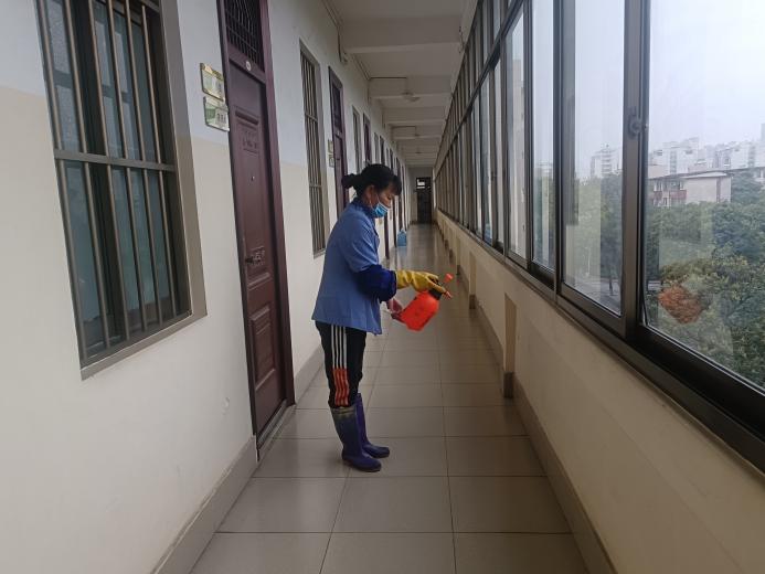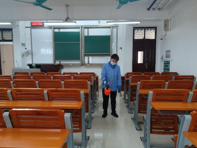 对公共教学楼宇的楼梯、走廊、门把手、课桌椅、电脑键盘、鼠标、水龙头、楼梯扶手、电梯间及按钮等高频接触表面进行重点杀菌消毒535次。