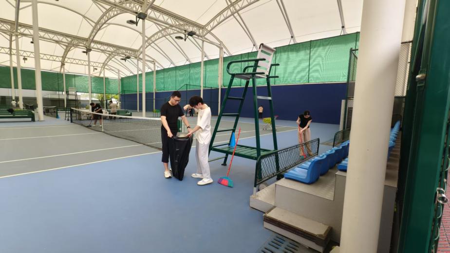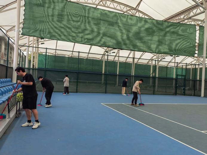 大学生在网球中心开展卫生保洁工作(图一)
