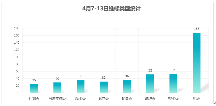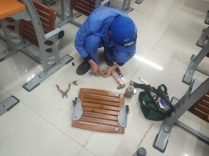 对学校公共设施进行日常巡查、维护,对师生报修问题及时维修、抢修,确保公共设施设备正常使用。本周共接单431单,其中电类168单,给水类36单,门窗类25单,排水类53单,疏通类52单,房屋本体类29单,桌椅类36单,其他类32单,完成431单。