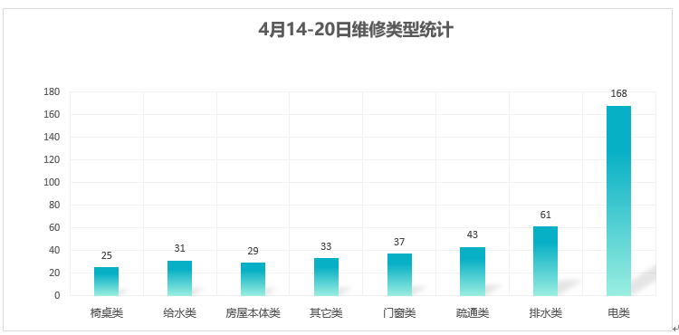 对学校公共设施进行日常巡查、维护,对师生报修问题及时维修、抢修,确保公共设施设备正常使用。本周共接单427单,其中电类168单,给水类31单,门窗类37单,排水类61单,疏通类43单,房屋本体类29单,桌椅类25单,其他类33单,完成427单。