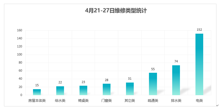 对学校公共设施进行日常巡查、维护,对师生报修问题及时维修、抢修,确保公共设施设备正常使用。本周共接单400单,其中电类152单,给水类22单,门窗类28单,排水类74单,疏通类55单,房屋本体类15单,桌椅类23单,其他类31单,完成365单。