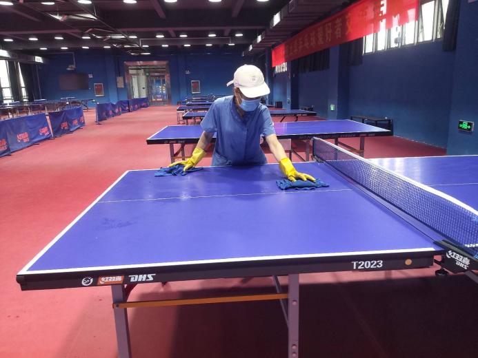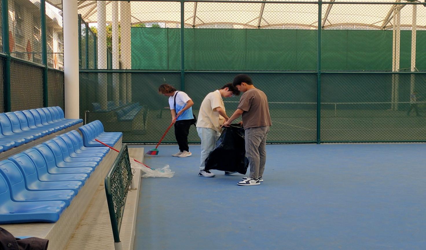 大学生在网球中心开展卫生保洁工作