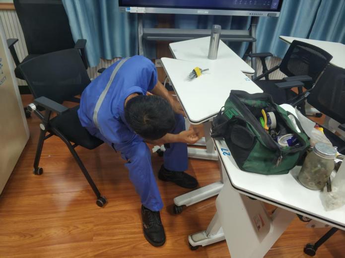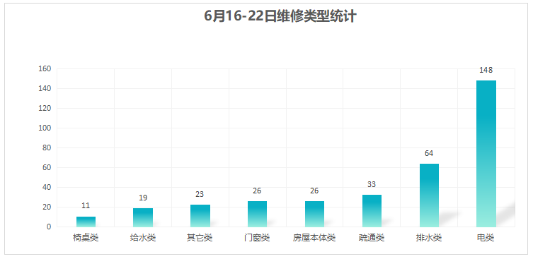 对学校公共设施进行日常巡查、维护,对师生报修问题及时维修、抢修,确保公共设施设备正常使用。本周共接单350单,其中电类148单,给水类19单,门窗类26单,排水类64单,疏通类33单,房屋本体类26单,桌椅类11单,其他类23单,完成332单。