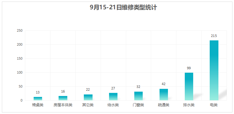 对学校公共设施进行日常巡查、维护,对师生报修问题及时维修、抢修,确保公共设施设备正常使用。本周共接单466单,其中电类215单,给水类27单,门窗类32单,排水类99单,疏通类42单,房屋本体类16单,桌椅类13单,其他类22单,完成466单。
