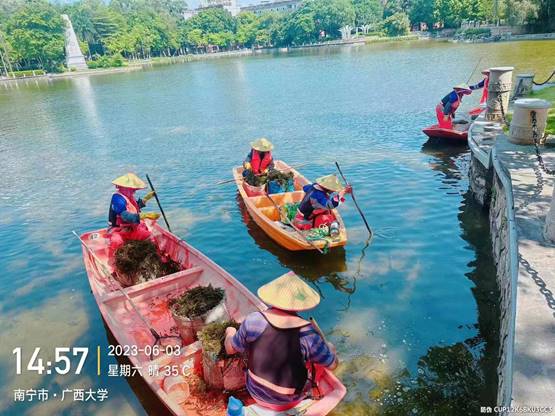 持续做好16个景观湖和4个景观池的湖水治理工作,清理大面积油膜,防止堆积,做好水面干净整洁;控鱼常态化进行,提高水质透明度,大碧云湖集中治理杂鱼;鉴湖,紫荆湖荷花补放复合肥;月牙湖,翠湖,爱莲湖治理青苔,打捞水底青苔;鉴湖割水草并一起清理青苔;镜湖放芽孢杆菌进行水质调理;巡查各湖水位情况,大碧云湖抽水补到紫荆湖约4500m³;对月牙湖污水入湖进行水质调理;大碧云湖补植水草;各湖睡莲残叶,烂叶修剪喷洒预防病虫害药剂。16个景观湖和4个景观池总计清运垃圾7.5吨。