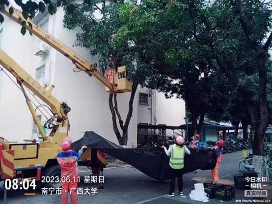 持续做好校园绿化养护工作,对春辉桥、学生公寓、碧云湖、新东园、外培楼、行健学院等区域的低枝、寄生枝修剪、枯枝处理、菟丝子清理、靠近建筑物树枝修剪作业;劝学岛、大学生活动中心、新东园、行健学院、农学院、六教、化工学院、商学院、君武馆、艺术学院等区域病虫害防治消杀;农场路、图书馆、农院路、行健学院、南大门、育才广场、碧云湖、艺术学院、国际学院、汇学堂等区域拔杂草、机械打草、松土施肥、绿篱修剪;南大门、综合楼区域盆栽淋水等其它绿化养护工作。本周完成机械打草14215平方米,淋水2145平方米,绿篱修剪7952平方米,拔杂草11215平方米,造型修剪36棵,修枯枝、低枝、寄生枝等2051棵,施肥1241平方米,病虫害消杀14125平方米,绿地落叶清理21741平方米。并对占用公共绿地的菜地进行清理。
