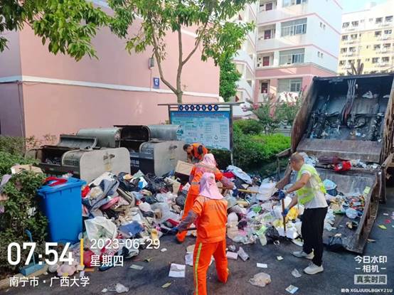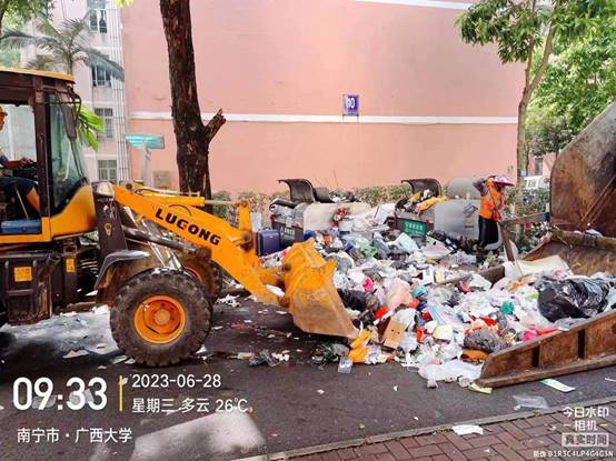 按计划完成太阳集团tyc138垃圾分类督导工作,组织专人进行定点垃圾分类督导与宣传,并对校园进行全面巡查,发现垃圾分类问题,及时处理。垃圾清运方面,由于本周是毕业季,学生离校在即,各类垃圾量暴增,为保证垃圾得到及时处理,后勤服务管理岗与物业公司启动垃圾清运应急预案,增加车辆和人手清理垃圾。本周清运生活垃圾约308.6吨,大件垃圾约20.5吨,绿化垃圾约12.7吨。