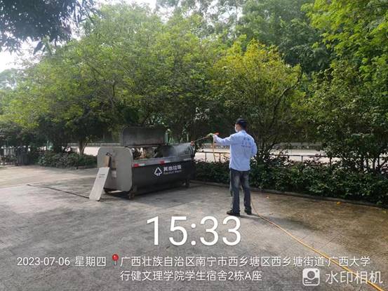 垃圾清运:本周毕业季毕业生集中离校,垃圾量暴增,后勤服务管理岗与物业公司继续启动垃圾清运应急预案,增加车辆和人手,临时增加16人(护工11人、司机5人)、3台三轮车及2台12吨压缩车协助清运,确保垃圾得到及时清运。本周清运生活垃圾约428.8吨,大件垃圾约25.7吨,绿化垃圾约35吨。
