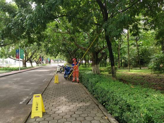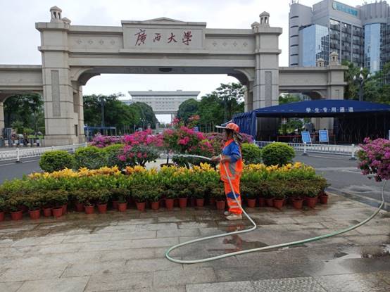 暑假期间,校园绿化养护工作主要为对校内绿地草坪进行修整及落叶杂草清理;对教学区域、办公区域等植物进行浇灌、施肥、病虫害防治;对校内各区域树木危枯枝、寄生树进行修剪及树木绿植的菟丝子清除;对校内各区域危树死树进行巡查及处理等作业以及做好校园各区域绿地盆栽淋水等。