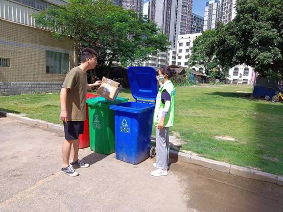 暑假期间垃圾分类督导员继续对各垃圾分类点进行分类督导,引导校内师生与住户正确分类投放垃圾,并继续进行垃圾分类宣传工作,提升校内师生对垃圾分类知识的学习进度,让广大师生与住户对垃圾分类知识有更好的了解并参与其中,养成自觉分类投递的良好行为习惯,7、8月份累计发放垃圾投放指南宣传单约20000多张。另外,对校内的智能垃圾箱、收集亭、宣传展板、垃圾桶、垃圾箱等进行清洁消毒、整理摆放;对垃圾桶、垃圾箱周边进行清洁打扫。校园巡查方面:在确保工作有序高效的开展情况下,垃圾分类督导员对校园进行全面巡查,发现问题及时处理。