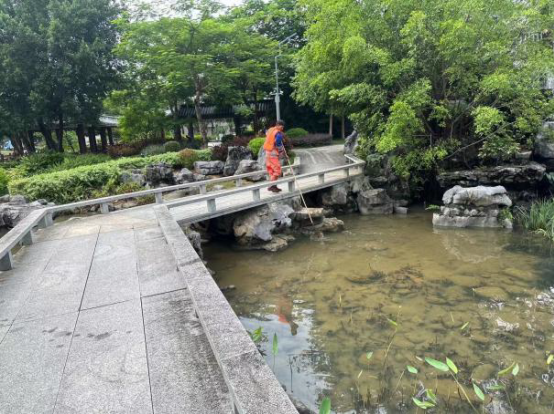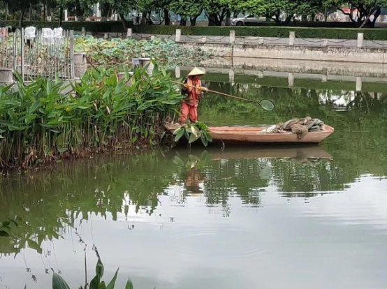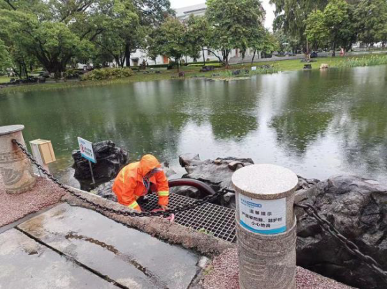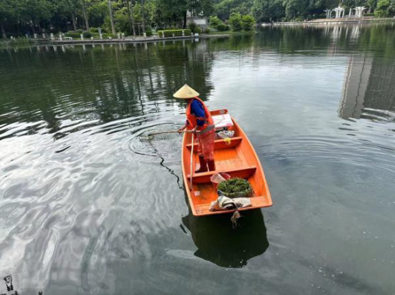 清理大面积油膜,保持水面干净整洁,为学校提供优质的校园环境。控鱼常态化进行,捕获杂鱼50斤,清理福寿螺及螺蛋约150 斤;修剪爱莲湖、秋实湖、彩蝶湖过密过长美人蕉和再力花;清除彩蝶湖清理驳岸两边杂草杂树和彩蝶湖、莲湖水底青苔。巡查各湖水位情况,进行排水降水作业并对污水入湖区域去味消毒。16 个景观湖和4 个景观池总计清运垃圾5吨。